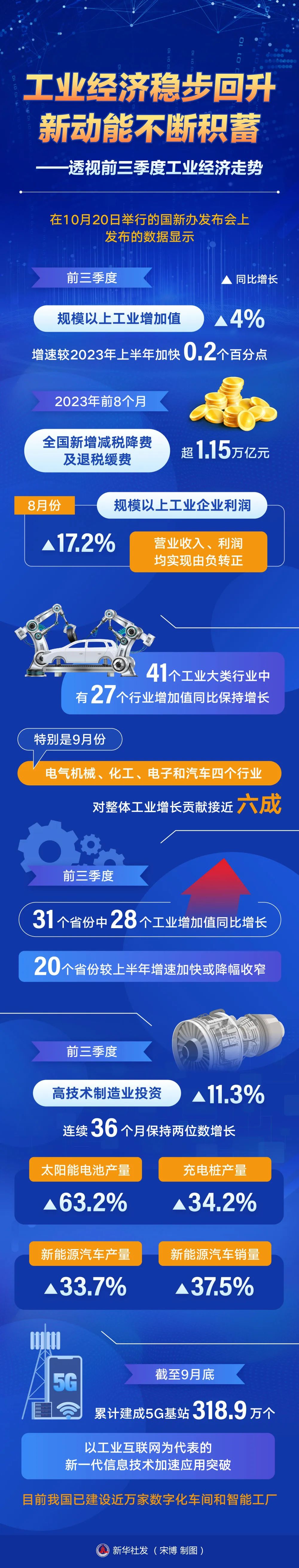 前三季度,高技術(shù)制造業(yè)投資同比增長11.3%,連續(xù)36個月保持兩位數(shù)增長。太陽能電池、充電樁產(chǎn)量分別增長63.2%、34.2%,新能源汽車產(chǎn)銷量同比分別增長33.7%、37.5%。