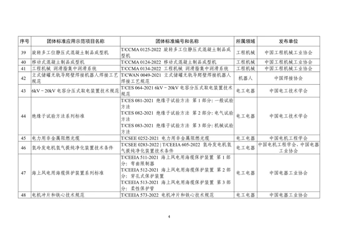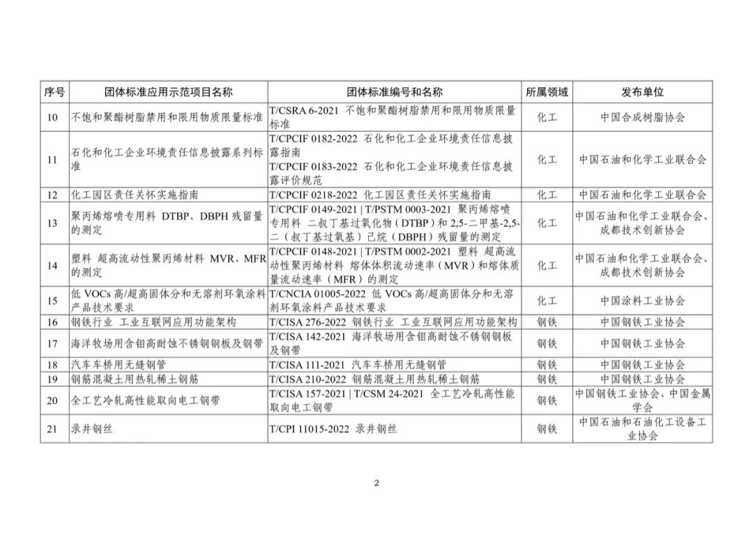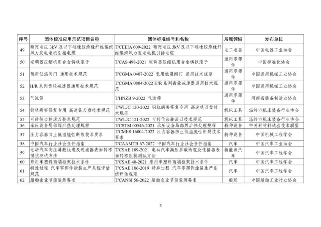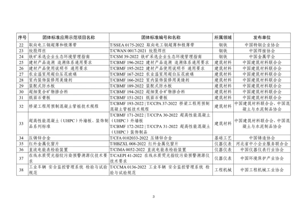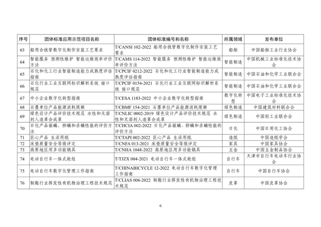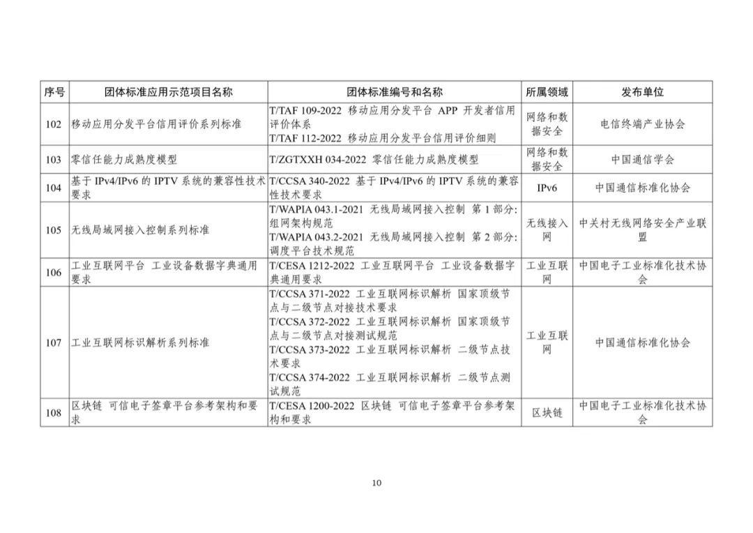 為深入貫徹落實《國家標準化發展綱要》,大力發展團體標準,推進團體標準應用示范,根據《工業和信息化部辦公廳關于開展2023年百項團體標準應用示范項目申報工作的通知》(工信廳科函〔2023〕165號)要求,經自愿申報、地方或行業推薦、專家審查和社會公示等環節,我部遴選出109項2023年團體標準應用示范項目(名單見附件),現予以公布。