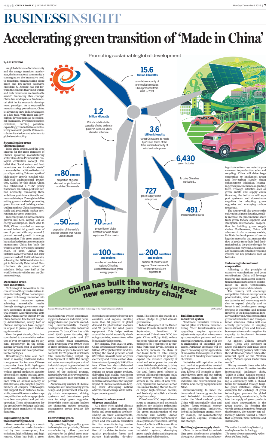 12月1日,《中國日報》刊發(fā)工業(yè)和信息化部黨組書記、部長李樂成英文署名文章,題為《加快中國制造綠色低碳轉(zhuǎn)型 促進全球可持續(xù)發(fā)展》。全文如下: