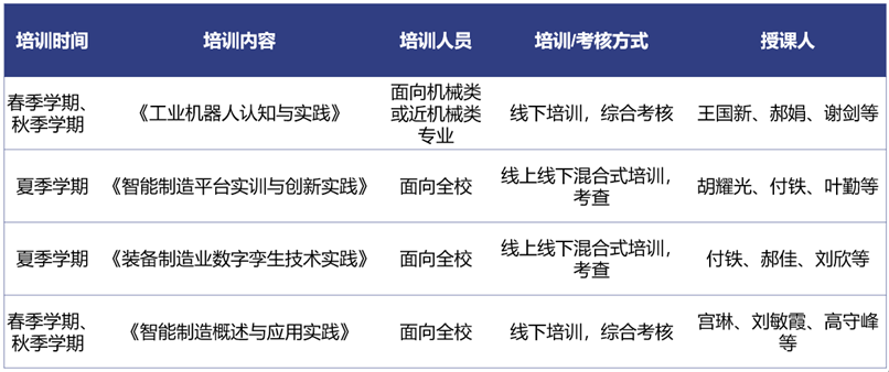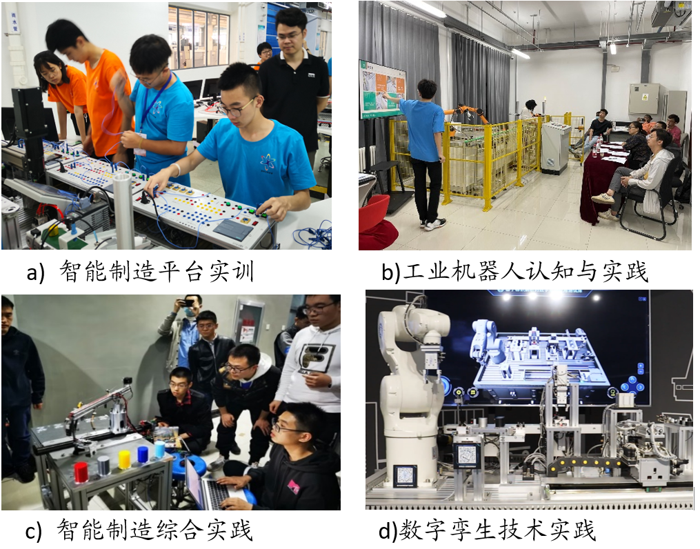 現(xiàn)有課程包括《工程訓(xùn)練》、《制造技術(shù)基礎(chǔ)訓(xùn)練》、《智能制造綜合實(shí)踐》、《工業(yè)機(jī)器人認(rèn)知與實(shí)踐》、《數(shù)字孿生技術(shù)實(shí)踐》、《智能制造平臺(tái)實(shí)訓(xùn)》以及《生產(chǎn)系統(tǒng)綜合設(shè)計(jì)與實(shí)驗(yàn)》等,從多個(gè)方向面向工業(yè)互聯(lián)網(wǎng)相關(guān)人才提供實(shí)踐能力、職業(yè)素養(yǎng)、創(chuàng)新精神等方面的綜合培養(yǎng),為培養(yǎng)適應(yīng)工業(yè)互聯(lián)網(wǎng)發(fā)展需要的高素質(zhì)、全面發(fā)展的產(chǎn)業(yè)人才提供良好實(shí)訓(xùn)條件??荚嚳己朔椒壳爸饕捎每疾榉绞剑詫?shí)踐任務(wù)完成情況為打分依據(jù),對(duì)學(xué)員進(jìn)行考核。