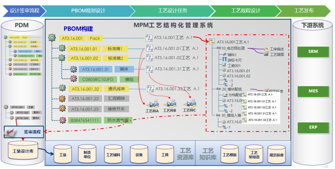場景描述:以工藝平臺為載體,結(jié)構(gòu)化管理工藝資源數(shù)據(jù),向上對接研發(fā)數(shù)據(jù)管理的PLM,向下對接MES、ERP、SRM等系統(tǒng),實現(xiàn)研發(fā)-工藝-制造的全數(shù)字化流程貫通,打破跨部門協(xié)作的壁壘,有效支撐研發(fā)設(shè)計與工藝更改協(xié)同,確保工藝更改閉環(huán),提升鋰電池生產(chǎn)效率。