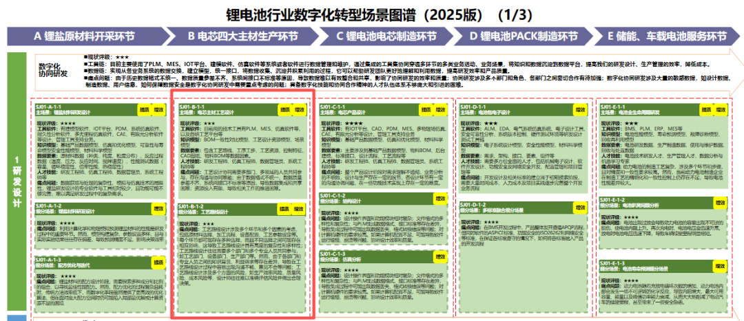 工業(yè)和信息化部9月16日印發(fā)《場景化、圖譜化推進重點行業(yè)數(shù)字化轉(zhuǎn)型的參考指引(2025版)》,其附件中給出14個行業(yè)場景圖譜(2025版),為各行業(yè)數(shù)字化轉(zhuǎn)型應(yīng)用實踐提供了方法指引。鋰電池行業(yè)數(shù)字化轉(zhuǎn)型場景圖譜涉及研發(fā)設(shè)計、生產(chǎn)制造、運維服務(wù)、經(jīng)營管理、供應(yīng)鏈管理等5個關(guān)鍵環(huán)節(jié)、73個典型場景。現(xiàn)對鋰電池行業(yè)的典型場景進行解讀。