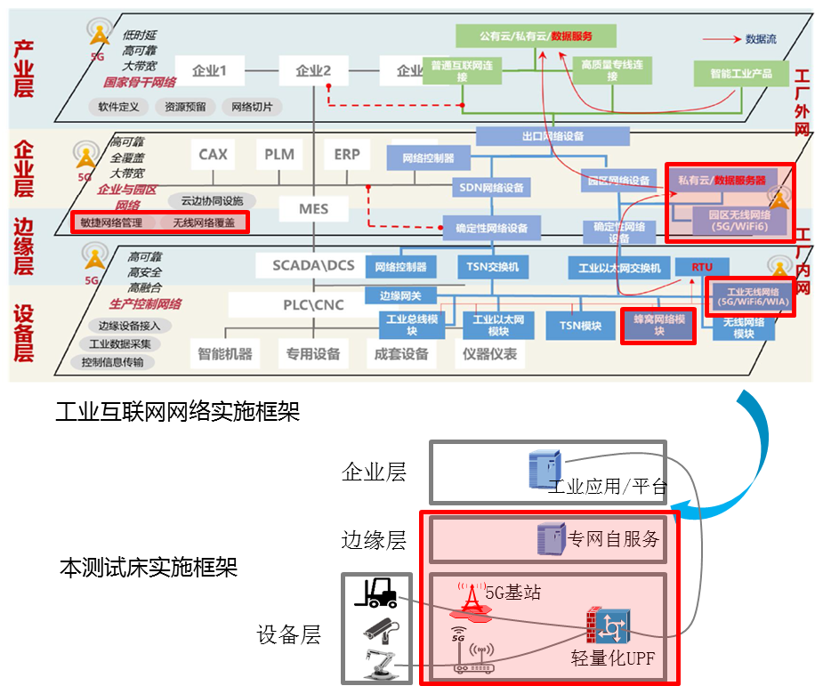 在工業互聯網網絡實時框架中,本測試床內容包含設備層的工業終端(5G蜂窩網絡模塊)、邊緣和企業層的5G無線網絡、本地邊緣計算(私有云)等,如下圖所示: