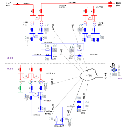 雄安新區(qū)110kV蔣莊、110kV臨河、110kV奧威變電站和35kV鄚州、35kV古州、35kV劇村、35kV王莊變電站以及35kV容東移動(dòng)站新配置5G差動(dòng)保護(hù)及自愈設(shè)備,實(shí)現(xiàn)基于5G通信的35kV線路(兩端、三端)差動(dòng)保護(hù),實(shí)現(xiàn)110kV臨河站、蔣莊站和奧威站站域備自投、基于5G通信的35kV劇村站和王莊站區(qū)域備自投功能以及高低壓不同等級(jí)的變電站之間上下級(jí)備自投協(xié)同優(yōu)化功能。同時(shí)部署主站端在線監(jiān)測(cè)系統(tǒng),實(shí)現(xiàn)智能故障分析等高級(jí)功能。