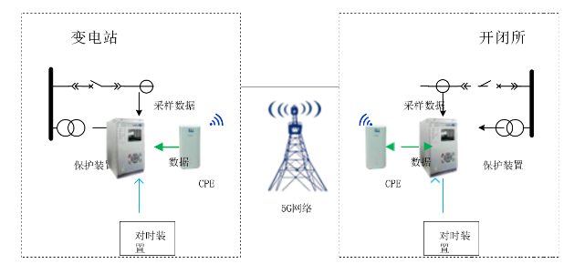 光纖差動(dòng)保護(hù)采用專用光纖或復(fù)用2M光纖通道,路由相同且收發(fā)延時(shí)一致,采用乒乓法原理進(jìn)行數(shù)據(jù)同步,不依賴外部時(shí)鐘同步。而5G差動(dòng)保護(hù)采用5G網(wǎng)絡(luò),通道延遲抖動(dòng)較大,傳輸延時(shí)不固定,上下行通道延時(shí)不一致,需要采用類似變電站內(nèi)組網(wǎng)SV采用的基于對(duì)時(shí)同步下的數(shù)據(jù)傳輸和采樣插值同步方案。當(dāng)前階段,5G無(wú)線終端CPE不支持對(duì)時(shí)輸出,只能采用外部時(shí)鐘同步,通過(guò)外部授時(shí)系統(tǒng)(北斗和GPS授時(shí))實(shí)現(xiàn)數(shù)據(jù)同步,配置如圖5-1所示。