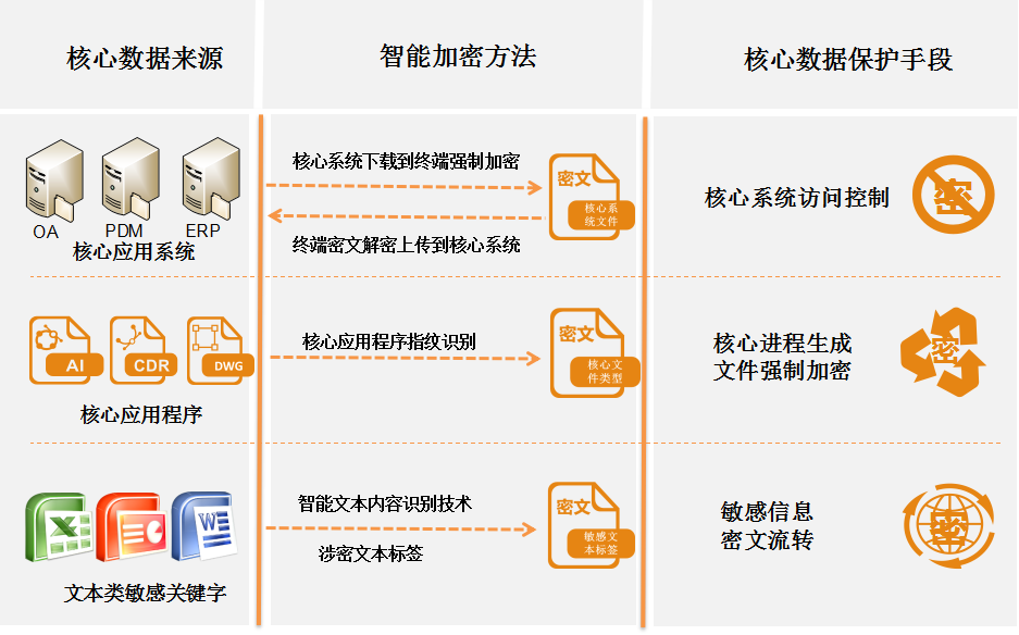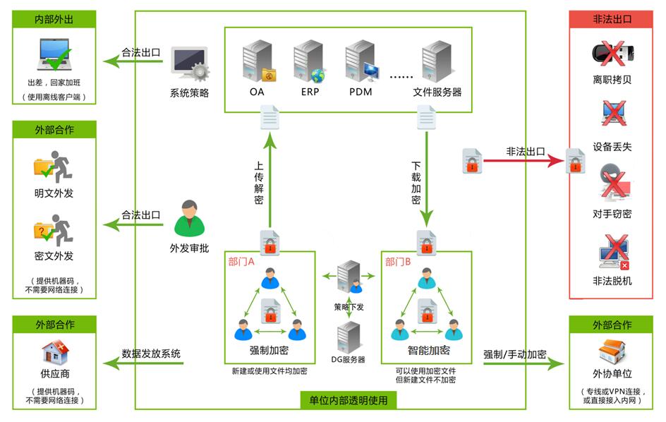 對系統(tǒng)敏感數(shù)據(jù)進(jìn)行智能識別、分級加密、權(quán)限管控,全方位提高自身信息安全管控能力,有效解決中車株所內(nèi)部合法用戶有意或者無意的信息泄漏。
