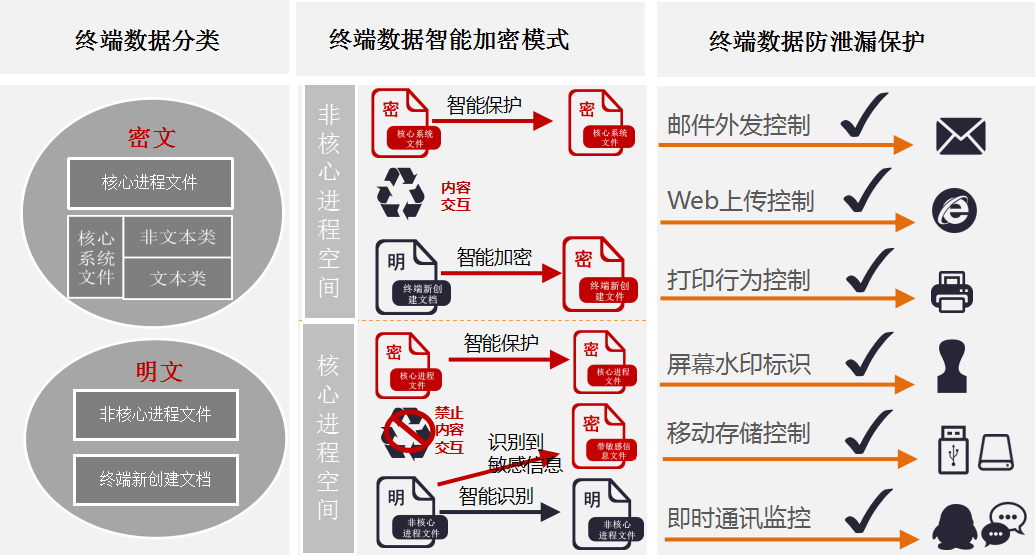 (1)終端數(shù)據(jù)智能安全防護(hù):包括數(shù)據(jù)智能安全子系統(tǒng)、終端虛擬化桌面子系統(tǒng)、終端桌面安全子系統(tǒng)、終端外設(shè)控制子系統(tǒng)、文件透明加密子系統(tǒng)等五個子系統(tǒng),有效防止機密信息泄漏。