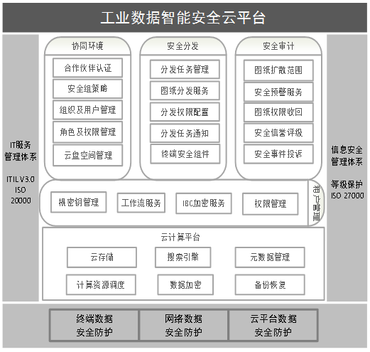 針對工業(yè)設(shè)計數(shù)據(jù)面臨的三大威脅,工業(yè)數(shù)據(jù)智能安全云平臺構(gòu)建了面向工業(yè)設(shè)計數(shù)據(jù)全生命周期安全管理的解決方案,包括工業(yè)圖紙協(xié)同研發(fā)設(shè)計環(huán)節(jié)的安全可控,及圖紙下單給外協(xié)方的電子商務(wù)結(jié)算環(huán)節(jié)、出圖進(jìn)行資源調(diào)配確定生產(chǎn)計劃環(huán)節(jié),直至下發(fā)至智能車間生產(chǎn)環(huán)節(jié),及后續(xù)產(chǎn)品發(fā)布環(huán)節(jié)的圖紙安全控制問題。
