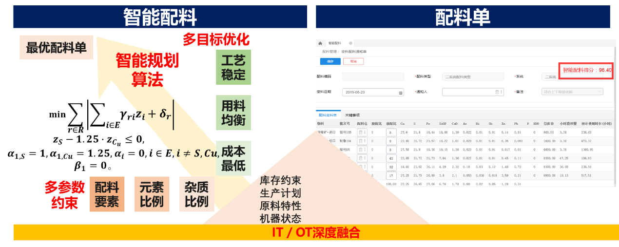 智能配料系統記錄配料相關的各種約束(約束條件在使用過程中進行迭代優化),動態調用最新原料的存量和元素含量,由智能算法進行原料的投入配比規劃輸出。
