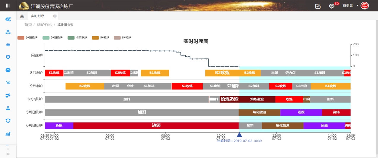 根據熔煉作業數據自動按熔爐組實時狀態形成節奏時序圖,提升整個熔煉系統調度指揮管理的智能化水平,以信息共享、過程可控、科學預判為重心,構建閃速爐、轉爐、陽極爐的生產管控的智能化支撐,共享三大爐完整的作業進度,及時、準確調整作業要求,實現作業預期判斷和產品質量最優控制。