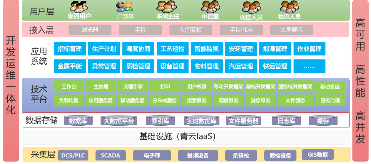 應用層:主要包括指標管理、生產計劃、調度協同、工藝巡檢、智能監視、安環管理、能源管理、作業管理、金屬平衡、異常管理、質檢管理、設備管理、物料管理、汽運管理、鐵運管理等。