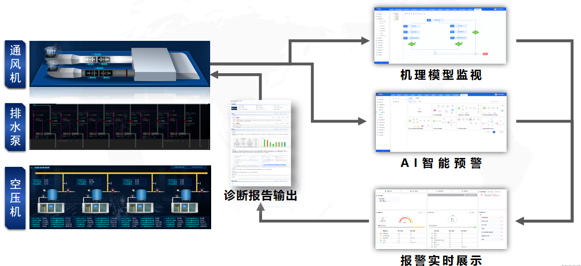 針對煤礦排水、通風、壓風、提升、供電、運輸、綜采七大核心系統設備進行了設備故障預警與診斷平臺的部署,打造了集設備總覽、故障診斷、專家庫、知識庫、領導駕駛艙、移動應用于一體的設備智能化管理體系,保證設備安全、可靠、經濟運行,降低檢修成本。