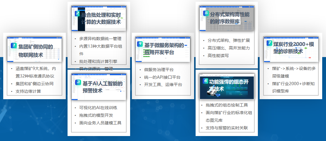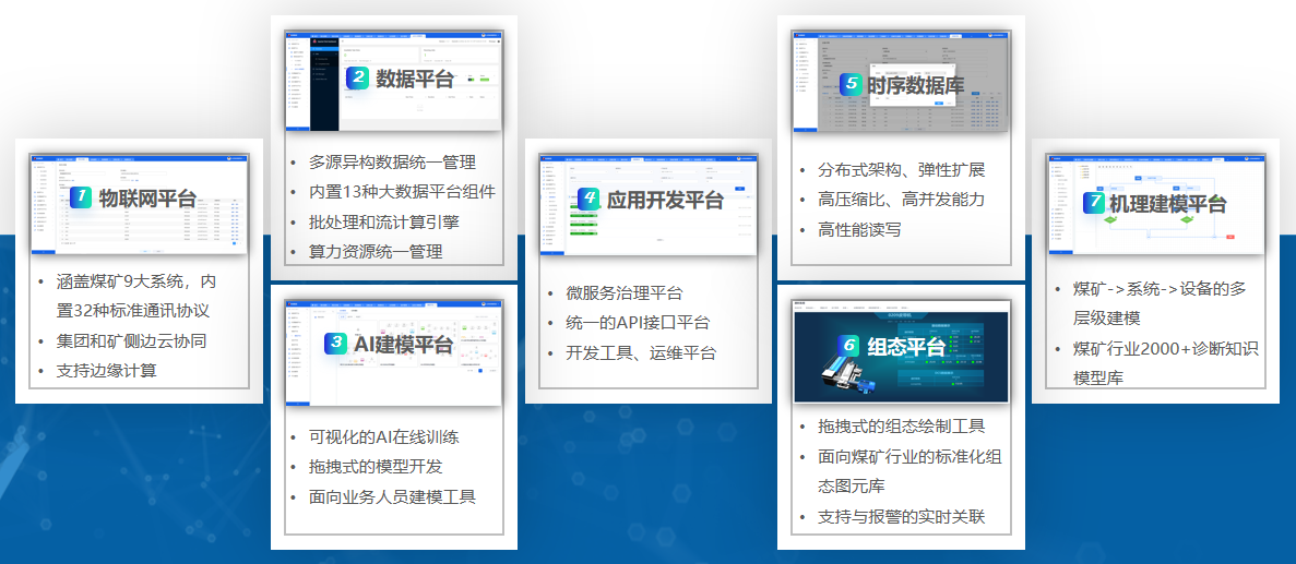(1)構建一個集團統一的煤炭行業工業互聯網基礎平臺,平臺至少包含物聯網平臺、數據平臺、AI建模平臺、機理建模平臺、應用開發與管理平臺、組態平臺、時序數據庫,為企業智能化應用建設提供基礎平臺支持;