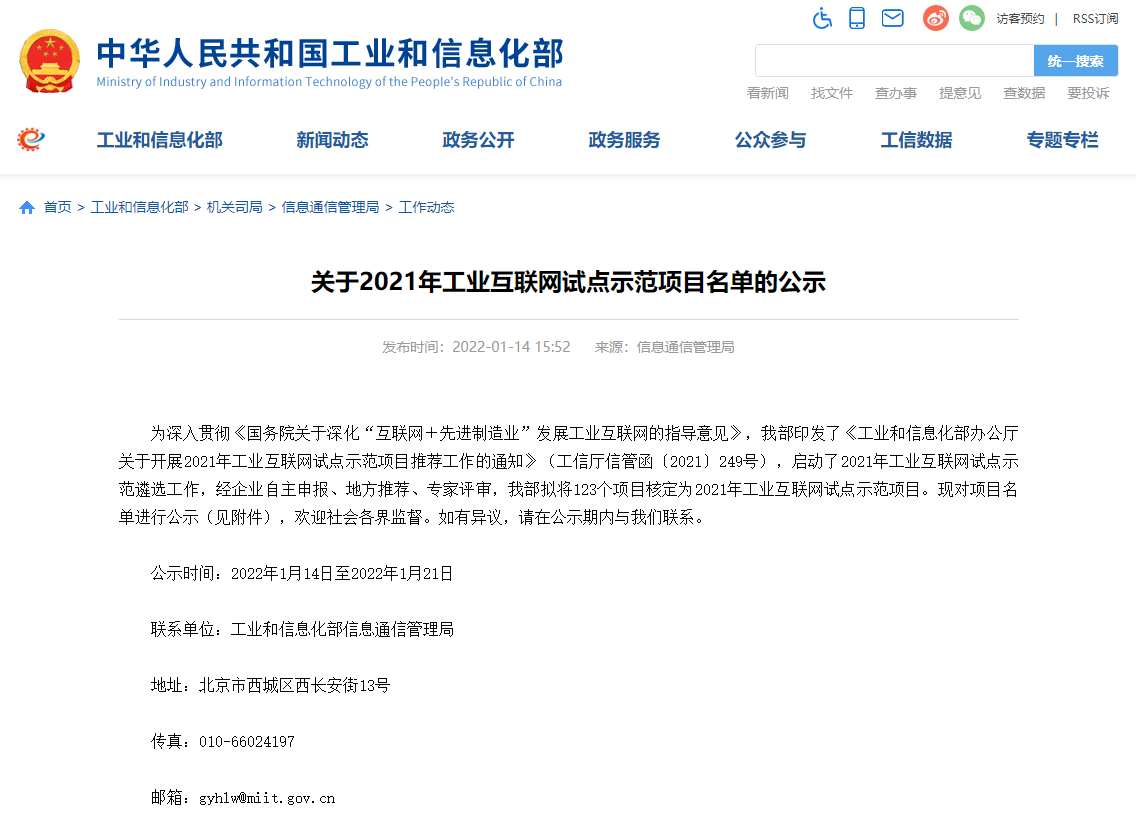 該項目榮獲工信部2021年“工業互聯網試點示范項目”工業互聯網+安全生產解決方案示范