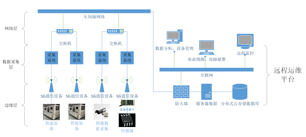 本項目運用5G+確定性網(wǎng)絡(luò)/時間敏感網(wǎng)絡(luò)(TSN)+邊緣計算+工業(yè)光網(wǎng)+ IPv6等技術(shù),通過物聯(lián)網(wǎng)系統(tǒng)和工業(yè)互聯(lián)網(wǎng)大數(shù)據(jù)平臺完成對智能裝備的整體生命周期的過程管控,運用遠程智能故障診斷系統(tǒng)代替人工分析診斷,能耗管理,運用BP神經(jīng)網(wǎng)絡(luò)為設(shè)備提供預(yù)測性維護,并給出維護策略,提高了運維效率;為智能制造企業(yè)提供SASS服務(wù),整合智能制造行業(yè)上下游資源,為智能制造客戶提供整體解決方案,提高行業(yè)整體服務(wù)水平和競爭力。通過對智能裝備運行的實時監(jiān)測,提供遠程維護、故障預(yù)測、性能優(yōu)化能一系列服務(wù),并反饋優(yōu)化產(chǎn)品設(shè)計,實現(xiàn)企業(yè)服務(wù)化轉(zhuǎn)型,開拓裝備服務(wù)新模式。