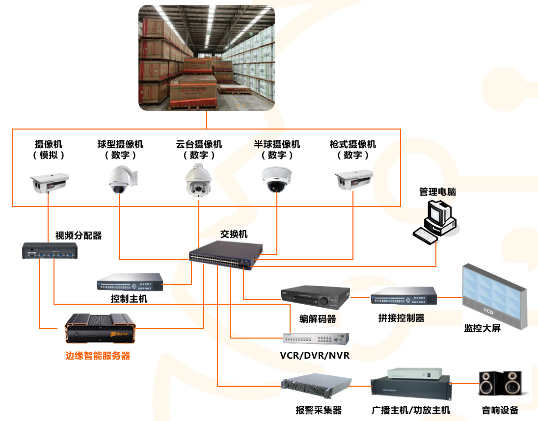 視頻智能分析系統(tǒng)由智能攝像頭、邊緣智能分析盒、智能交互管控平臺(tái)、告警設(shè)備組成: