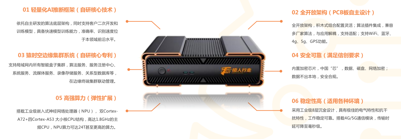智能盒子采用嵌入式設(shè)計(jì)原理,內(nèi)嵌基于深度學(xué)習(xí)的結(jié)構(gòu)化算法,集成高性能模塊,搭載工業(yè)級(jí)嵌入式神經(jīng)網(wǎng)絡(luò)處理器(NPU),雙Cortex-A72+四Cortex-A53大小核CPU結(jié)構(gòu),高達(dá)1.8GHz的主頻CPU,NPU算力可達(dá)3.0TOPs,可擴(kuò)展至強(qiáng)勁的12T甚至更高的算力。支持局域網(wǎng)內(nèi)所有智能盒子集群,算法服務(wù)、服務(wù)注冊(cè)中心、系統(tǒng)服務(wù)、流媒體服務(wù)、錄像存儲(chǔ)服務(wù)、關(guān)系型數(shù)據(jù)庫(kù)等,在邊緣終端集群聯(lián)動(dòng)管理。支持H265/H264視頻解碼,外圍接口豐富,擁有超強(qiáng)擴(kuò)展性,支持對(duì)多路攝像頭進(jìn)行視頻結(jié)構(gòu)化識(shí)別和分析。產(chǎn)品安全性高,內(nèi)置加密芯片,對(duì)數(shù)據(jù)、磁盤、網(wǎng)絡(luò)接下加密,數(shù)據(jù)不出本地,安全合規(guī),采用工業(yè)級(jí)設(shè)計(jì),100%安全保障。通過AI算法,利用圖像識(shí)別技術(shù)對(duì)視頻進(jìn)行高效、快速的分析處理,具有輕量化、高性能、低功耗、通用性強(qiáng)、接入方便等特點(diǎn),廣泛應(yīng)用于AI態(tài)勢(shì)感知、行為分析等各個(gè)領(lǐng)域。