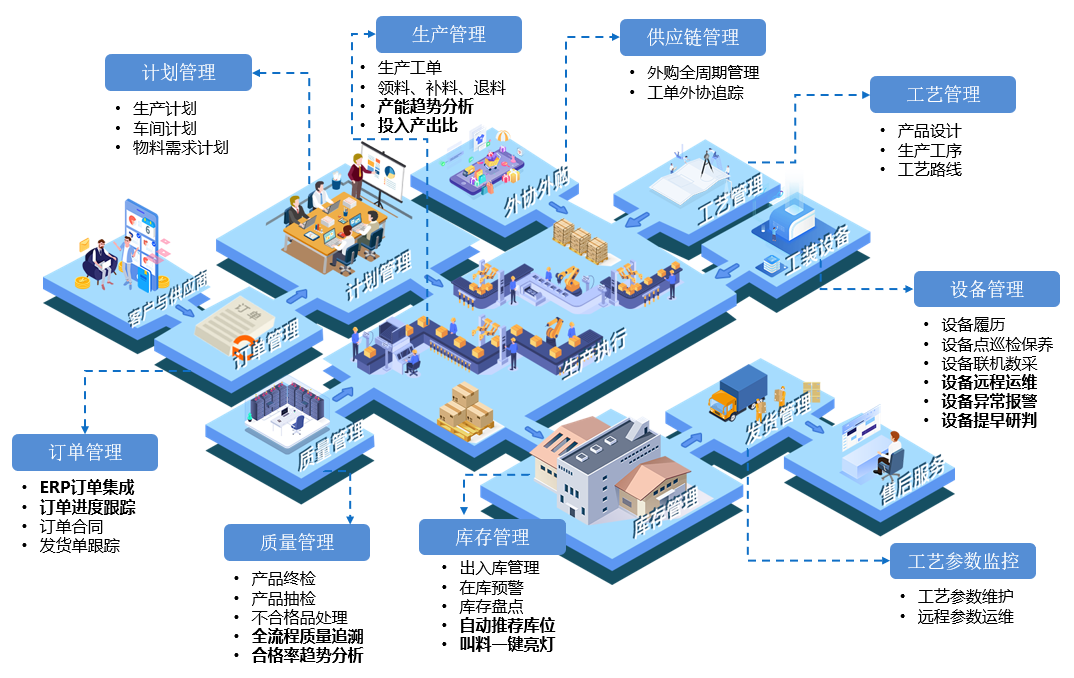 面向企業(yè),提供一體化MES + 輕ERP生產(chǎn)數(shù)字化解決方案,實現(xiàn)以生產(chǎn)為核心的產(chǎn)供銷一體化數(shù)據(jù)連通和高效協(xié)同,幫助企業(yè)縮短訂單交付周期、提升產(chǎn)品品質(zhì)、提升內(nèi)部溝通效率等,進(jìn)而降低企業(yè)管理成本,提高生產(chǎn)效率。