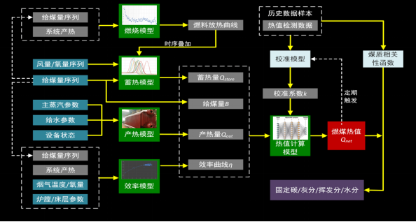燃煤作為熱電廠最主要的原料,是影響熱電廠控制的關鍵。燃煤作為天然礦物其成份是不均勻的,而且大多數(shù)熱電廠都需要將多種來源的燃煤進行摻配使用,所以實時入爐的燃煤品質是波動的。目前還沒有有效的技術對燃煤成份進行在線實時檢測,所以燃煤成份都是通過抽樣離線化驗獲得的。當煤質發(fā)生較大變化時,缺乏煤質的及時感知會導致控制不穩(wěn)定的問題。如下是一套煤質軟測量的原理圖: