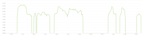 蒸汽和水的流量在熱電控制中也非常重要,但許多流量計在流量低于一定量后容易進入流量計的檢測死區(qū),出現(xiàn)測量值歸零的現(xiàn)象,如下圖所示,當流量低于15噸時測量值直接歸零: