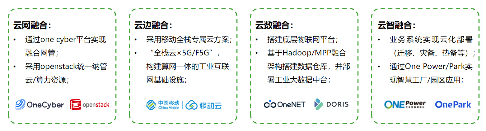 通過“5G尊享專網+工業PON+全棧云+多網融合、多云協同、云網統管”的綜合解決方案,將生產網(工業總線+工業以太網/工業全光網+工業無線網/5G尊享專網)、辦公網(有線/WiFi6)、視頻網(PON)、物聯網(NB/UWB/ZigBee)、企業核心網(集群、堆疊、v4/v6雙棧)和邊緣云(車間級MEC)、企業大數據中心(私有云)、工業SaaS云平臺(公有云)有機結合起來,通過云管(OpneStack)和網管平臺(OneCyber)將計算資源、存儲資源和網絡資源進行集成,構建OICT工業基礎設施助力企業數字化轉型。