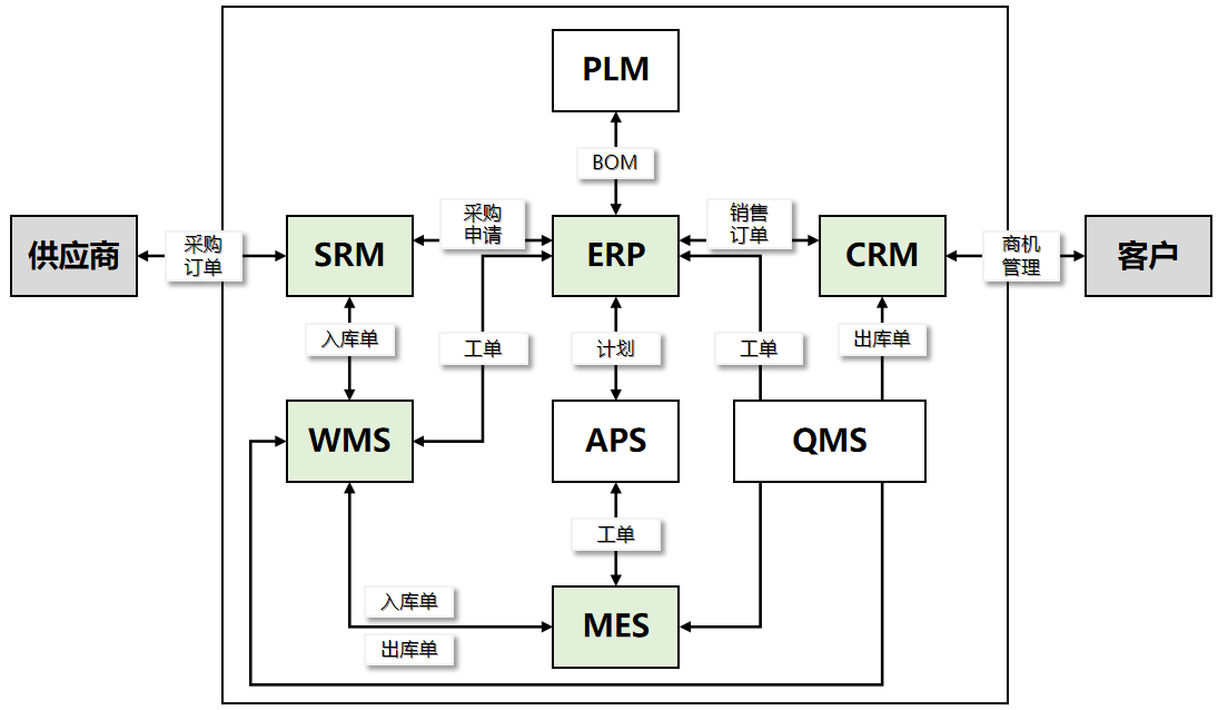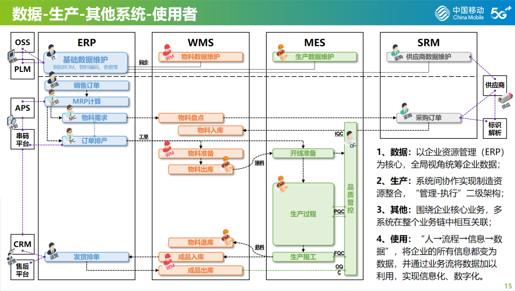 智造管理:通過MES、SRM、WMS、APS、PLM等一系列工業信息化系統,實現生產要素的充分運用,打通OT域與IT域。