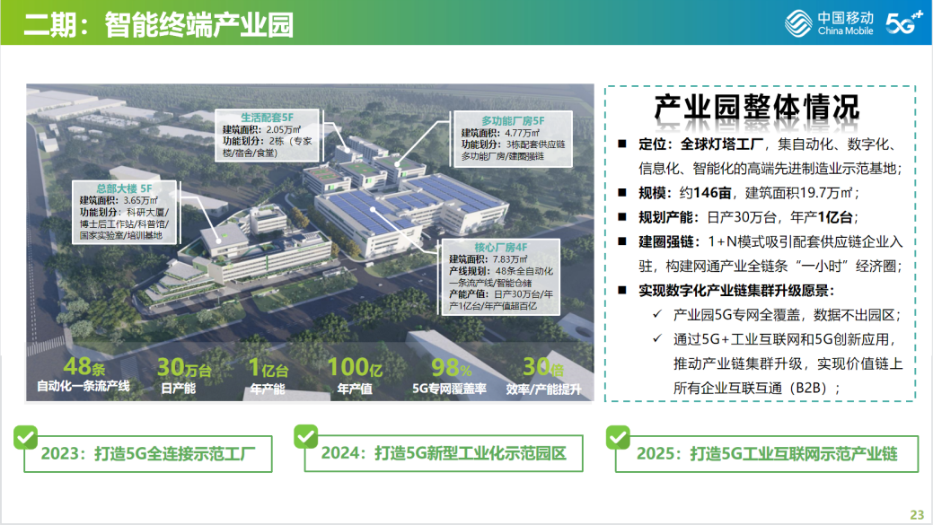 二期項目將充分利用以5G為代表的新一代信息通信技術集成,以打造“5G全連接工廠”“全球燈塔工廠”為目標,通過3年時間深化“5G+工業互聯網”實踐,建設新型工業互聯網基礎設施,新建或改造產線級、車間級、工廠級等生產現場,形成生產單元廣泛連接、信息(IT)運營(OT)深入融合、數據要素充分利用、創新應用高效賦能的先進工廠,打造國家級5G全連接示范工廠、5G新型工業化示范園區和5G工業互聯網示范產業鏈。