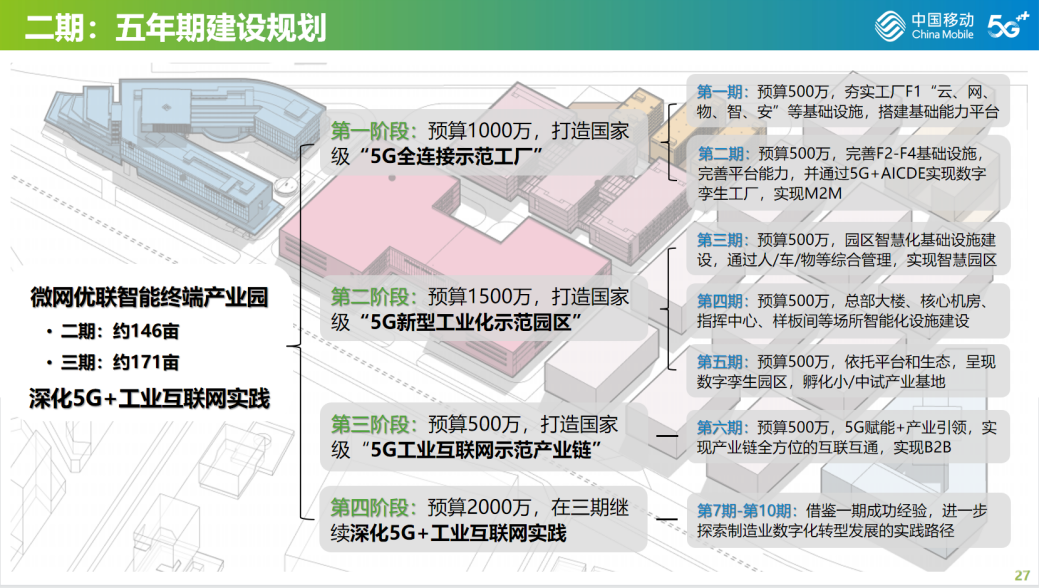 下一步實施計劃的建設目標,將會圍繞“5G全連接示范工廠”、“5G新型工業化示范園區”和“5G工業互聯網示范產業鏈”,打造數字經濟與實體經濟融合新標桿。主要建設內容為: