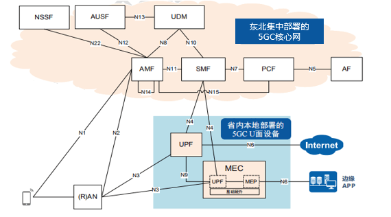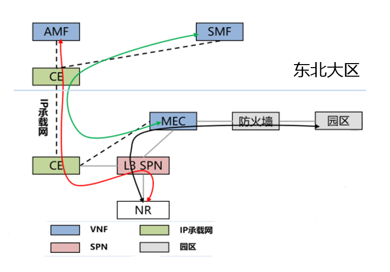 MEC設(shè)備部署在企業(yè)信息化機(jī)房。gNB與AMF間的 N2 接口通過SPN+IP承載網(wǎng)承載。gNB 與邊緣UPF的N3接口通過 SPN 承載。要求與邊緣 UPF對(duì)接的SPN提供3層能力。SMF與邊緣UPF間的N4接口采用直連方式,通過SPN+IP承載網(wǎng)互通。邊緣UPF通過IP承載網(wǎng)網(wǎng)管CE與東北大區(qū)EMS進(jìn)行通信。網(wǎng)管接口通過SPN+IP承載網(wǎng)承載。