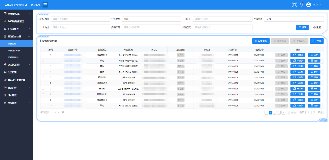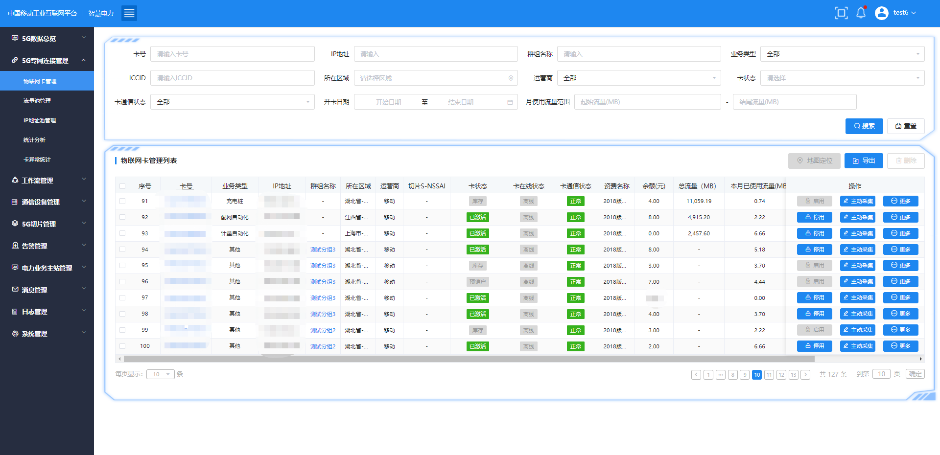 5G電力專網(wǎng)連接管理,可實(shí)現(xiàn)對(duì)于電力業(yè)務(wù)中使用的無線通信卡資源的管理,對(duì)其進(jìn)行記錄和統(tǒng)計(jì)分析。無線通信卡數(shù)據(jù)包括IP地址管理、域名管理、卡資費(fèi)情況、流量使用情況等。目前平臺(tái)已接入1萬多張物聯(lián)卡,建立卡臺(tái)賬、資費(fèi)等信息,實(shí)現(xiàn)物聯(lián)網(wǎng)卡的精細(xì)化管理。