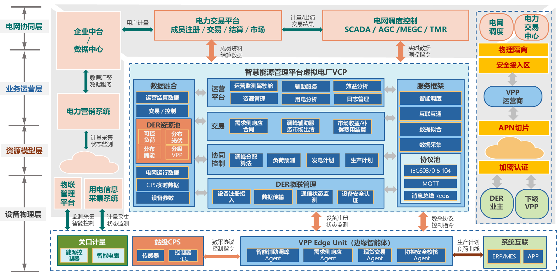 虛擬電廠運(yùn)營(yíng)平臺(tái)聚合分布式能源和需求側(cè)資源參與電網(wǎng)運(yùn)行,將分布式發(fā)電DG、分布式儲(chǔ)能設(shè)施和可控負(fù)荷有機(jī)結(jié)合,通過配套的調(diào)控技術(shù)、通信技術(shù)實(shí)現(xiàn)對(duì)分布式能源進(jìn)行聚合、優(yōu)化、協(xié)同控制的載體,以作為一個(gè)特殊電廠參與電力市場(chǎng)和電網(wǎng)運(yùn)行,可以看作是一種先進(jìn)的區(qū)域性電能集中管理模式,實(shí)現(xiàn)電源側(cè)的多能互補(bǔ)和負(fù)荷側(cè)的靈活互動(dòng),其核心在于“聚合”和“通信”。