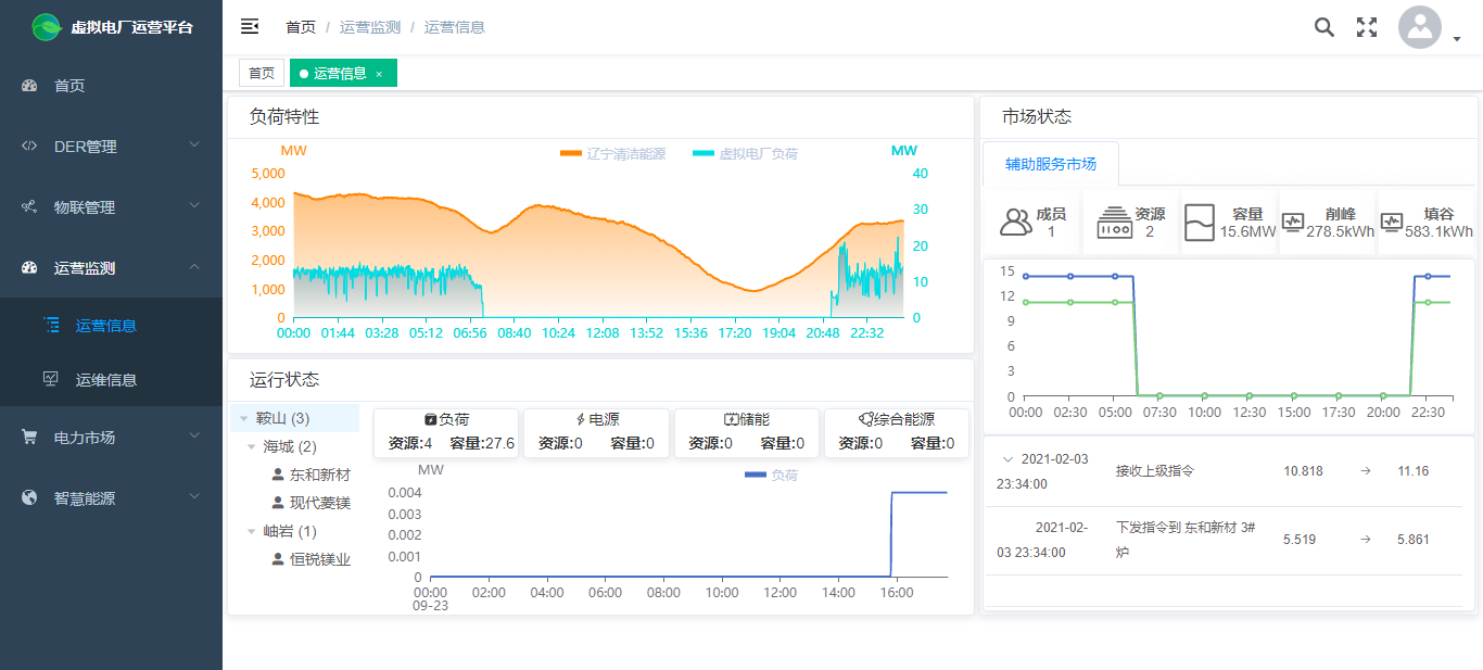 運(yùn)營(yíng)信息:展示虛擬電廠參與電網(wǎng)的特性信息,包含清潔能源日曲線、負(fù)荷日曲線;展示虛擬電廠資源接入情況與區(qū)域運(yùn)行曲線;展示虛擬電廠參與輔助服務(wù)市場(chǎng)的運(yùn)營(yíng)信息,包含資源統(tǒng)計(jì)、可調(diào)范圍、調(diào)峰事件。