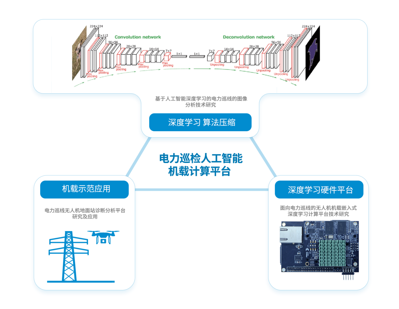 通過研究適用電力無人機(jī)巡檢的目標(biāo)檢測深度學(xué)習(xí)算法,開發(fā)適用于低功耗、低載荷限制的無人機(jī)機(jī)載人工智能計算平臺,研究機(jī)載人工智能計算平臺與無人機(jī)系統(tǒng)的集成技術(shù),提出機(jī)載人工智能計算平臺與無人機(jī)的交互方案,以實現(xiàn)電力無人機(jī)巡檢的目標(biāo)智能檢測識別、云臺自動調(diào)整對目標(biāo)部件逐個拍攝,提升巡檢效率。