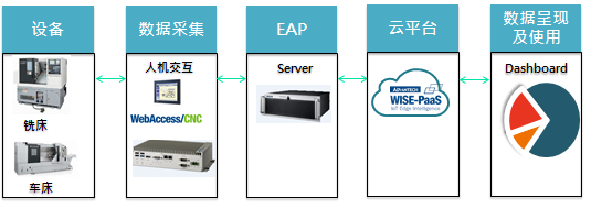 從底層數(shù)據(jù)采集到數(shù)據(jù)邊緣運算,并通過WisePaas Dashboard呈現(xiàn),實現(xiàn)數(shù)據(jù)的可視化。初步擬定以車床車間和銑床車間為一期工程,提供開放式系統(tǒng)平臺,全面實現(xiàn)設(shè)備聯(lián)網(wǎng)、數(shù)據(jù)采集,數(shù)位化智能管理等預期。在一期工程完成后,借助研華方案強大的可擴展性,在系統(tǒng)架構(gòu)上可彈性實現(xiàn)其他廠區(qū)車間的工程布建。