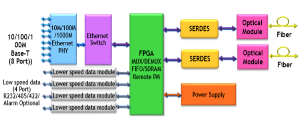 1)接入層設(shè)備根據(jù)端口數(shù)量不同分為多款。其信號(hào)處理原理相同,不同之處在于提供給用戶的以太網(wǎng)接口和低速數(shù)據(jù)接口的數(shù)量。低速數(shù)據(jù)接口可以靈活配置為RS-232、RS-485、通用輸入輸出接口GPIO、開(kāi)關(guān)量或CAN-BUS接口。接入設(shè)備提供兩個(gè)上聯(lián)光口,速率1.25Gbit/s,可以和其它接入設(shè)備組成鏈形或環(huán)形網(wǎng),通過(guò)光纖再與中間傳輸層設(shè)備的下聯(lián)端口連接,實(shí)現(xiàn)接入層設(shè)備與傳輸層設(shè)備的互通。接入層設(shè)備功能框圖如下圖所示。