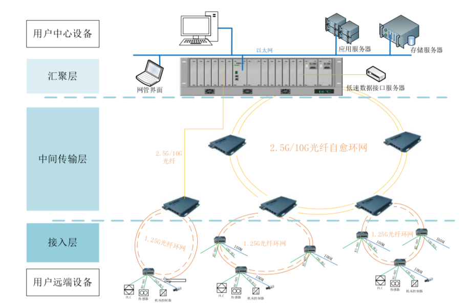 接入層設(shè)備:連接用戶的遠(yuǎn)端設(shè)備,如傳感器、機(jī)床控制器、生產(chǎn)線機(jī)器人、網(wǎng)絡(luò)視頻攝像機(jī)等設(shè)備,把用戶的低速數(shù)據(jù)和以太網(wǎng)數(shù)據(jù)進(jìn)行時(shí)分復(fù)用后,轉(zhuǎn)換為光信號(hào),通過(guò)光纖傳送給上層設(shè)備。反向完成光信號(hào)到電信號(hào)的轉(zhuǎn)換,時(shí)隙信息解析,把低速數(shù)據(jù)和以太網(wǎng)數(shù)據(jù)分別送給相應(yīng)用戶設(shè)備。