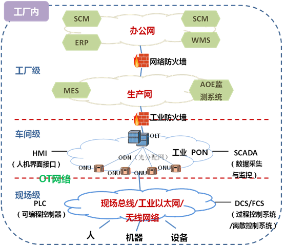 圖2-2 工業(yè)PON設(shè)備在工廠內(nèi)網(wǎng)絡(luò)中的位置