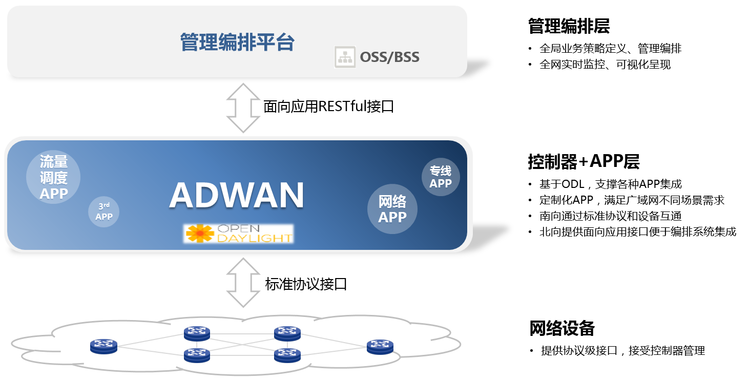 2)控制器+APP層:ADWAN分支解決方案的SDN控制器基于開源的ODL平臺,支撐各種APP集成;根據(jù)廣域網(wǎng)不同的場景,比如DCI網(wǎng)絡、骨干網(wǎng)、分支接入等,開發(fā)定制化、場景化的APP,滿足用戶在不同場景下的網(wǎng)絡需求;南向通過標準南向接口協(xié)議和設備互通;北向面向用戶提供定制化的API接口,實現(xiàn)和編排系統(tǒng)集成,滿足用戶差異化的業(yè)務需求;