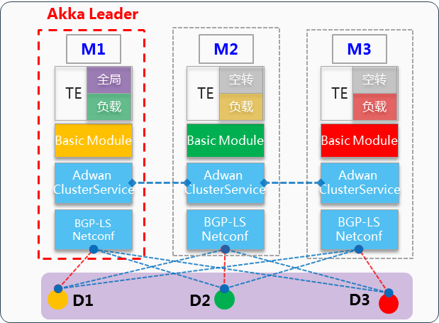 AD-WAN控制器集群由3臺控制器組成,互為備份,通過ODL Akka集群機制進行集群同步。集群控制器間工作模式為1主N備,同一時刻僅有一臺主控制器對外提供服務。當集群Leader故障后,由ODL akka重新選舉集群Leader,新選舉的主Leader負責集群業(yè)務管理,其余控制器作為備份。
