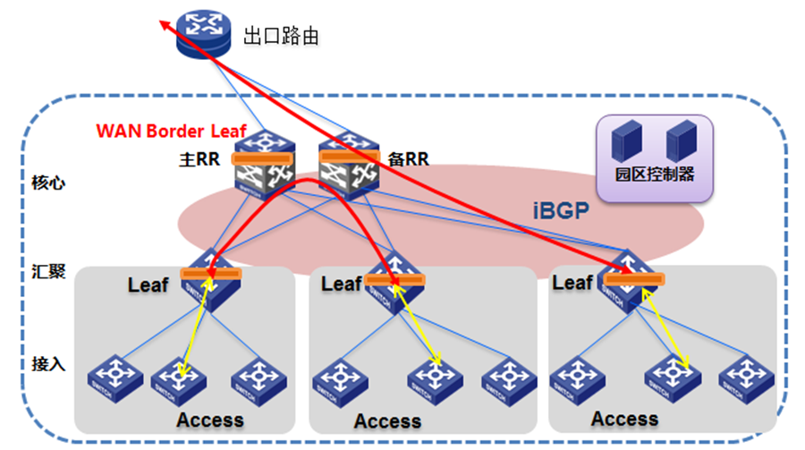 整個(gè)工廠網(wǎng)絡(luò)由核心、匯聚、接入三層設(shè)備組成,再搭配園區(qū)SDN控制器。其中接入層設(shè)備部署在生產(chǎn)線附近,而匯聚、核心設(shè)備之間則構(gòu)建overlay網(wǎng)絡(luò),同時(shí)采用分布式L3網(wǎng)關(guān)并通過(guò)可靠機(jī)制來(lái)抑制廣播風(fēng)暴。接入層設(shè)備采用不同的VLAN進(jìn)行接入位置的標(biāo)識(shí),通過(guò)TRUNK的方式上行到匯聚層,匯聚層完成VLAN到VxLAN的映射。