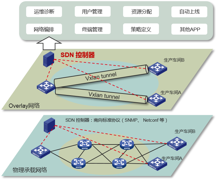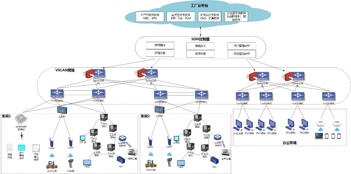 ? 核心匯聚層:本次方案采用SDN VxLAN技術(shù)設(shè)計(jì)工廠內(nèi)核心匯聚層網(wǎng)絡(luò),網(wǎng)絡(luò)可以抽象為物理承載網(wǎng)絡(luò)和面向應(yīng)用的Overlay網(wǎng)絡(luò)。這種網(wǎng)絡(luò)設(shè)計(jì)方式的兩大特征是柔性網(wǎng)絡(luò)和軟件定義。柔性一方面指網(wǎng)絡(luò)架構(gòu)靈活,業(yè)務(wù)部署(應(yīng)用/終端)與位置無(wú)關(guān);另一方面指以人和業(yè)務(wù)應(yīng)用為核心,所有網(wǎng)絡(luò)資源根據(jù)人和業(yè)務(wù)需要移動(dòng)。軟件定義指基于SDN思想將網(wǎng)絡(luò)控制平面集中,實(shí)現(xiàn)網(wǎng)絡(luò)設(shè)備的自動(dòng)部署、業(yè)務(wù)按需交付,將運(yùn)維人員從重復(fù)勞動(dòng)中解放出來(lái)。