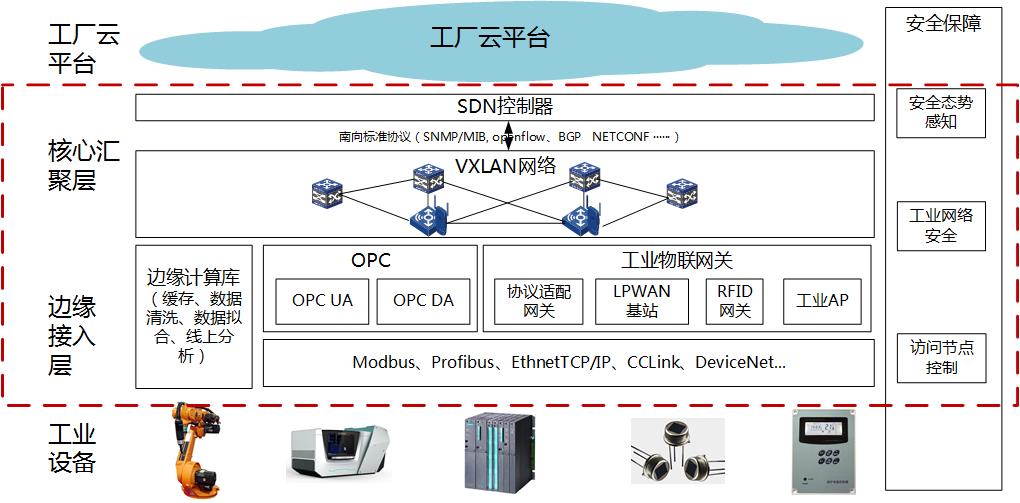 ADNET智能工廠網(wǎng)絡(luò)的建設(shè)內(nèi)容位于上圖紅框中,含邊緣接入層、核心匯聚層和安全保障三部分,其中:
