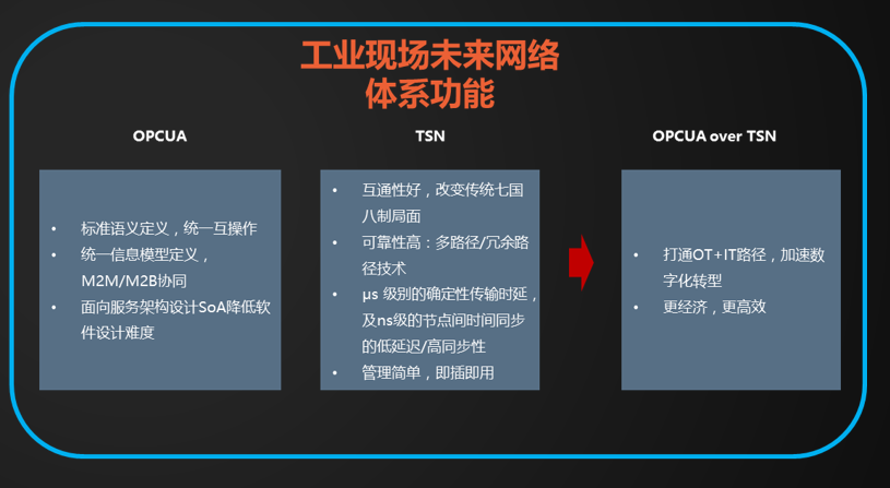 TSN+OPC UA組合提供了一個(gè)實(shí)時(shí)、高確定性并真正獨(dú)立于設(shè)備廠商的通信網(wǎng)絡(luò),將會(huì)在帶寬、安全、互操作、延遲和同步等方面帶來巨大改善。