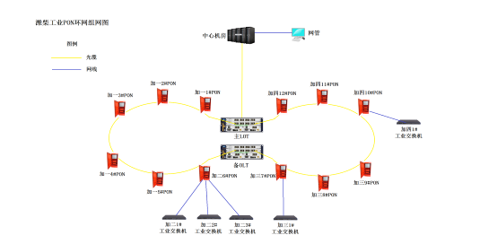 工業(yè)PON網(wǎng)絡(luò)的拓?fù)浣Y(jié)構(gòu)可與各車(chē)間信息節(jié)點(diǎn)無(wú)縫結(jié)合,可根據(jù)需要組成多鏈路備份的樹(shù)形結(jié)構(gòu)、環(huán)形結(jié)構(gòu)等傳送網(wǎng)絡(luò)。網(wǎng)絡(luò)拓?fù)鋱D如下所示: