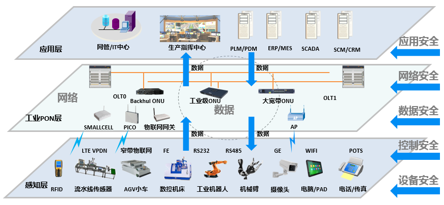 工業(yè)PON是車間級(jí)網(wǎng)絡(luò),對(duì)生產(chǎn)線設(shè)備(如數(shù)控機(jī)床)有線網(wǎng)絡(luò)覆蓋,同時(shí)通過對(duì)無線網(wǎng)絡(luò)承載實(shí)現(xiàn)車間有線無線一體化網(wǎng)絡(luò)覆蓋。工業(yè)PON針對(duì)工業(yè)各類應(yīng)用場(chǎng)景,滿足工業(yè)場(chǎng)景下的各種工業(yè)控制總線場(chǎng)景要求,提供工業(yè)場(chǎng)景類型接口。可為工業(yè)控制、信號(hào)量監(jiān)控、數(shù)據(jù)傳輸、語音通信、視頻監(jiān)控等各種業(yè)務(wù)應(yīng)用提供支持。各業(yè)務(wù)流通過PON系統(tǒng)上行后,由OLT匯聚上聯(lián)GE/FE接口連接到工廠級(jí)網(wǎng)絡(luò),實(shí)現(xiàn)智能制造MES、ERP、PLM等系統(tǒng)和下層物理設(shè)備的對(duì)接,從而實(shí)現(xiàn)工業(yè)控制、數(shù)據(jù)采集分析、視頻監(jiān)控等功能。