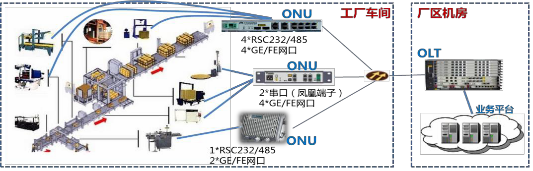 工業(yè)PON處于車間級(jí)網(wǎng)絡(luò)位置,通過工業(yè)級(jí)ONU設(shè)備實(shí)現(xiàn)光網(wǎng)絡(luò)到設(shè)備層的連接,通過光分配網(wǎng)絡(luò)(ODN),實(shí)現(xiàn)工業(yè)設(shè)備數(shù)據(jù)、生產(chǎn)數(shù)據(jù)等到OLT的匯聚,最終通過OLT與企業(yè)網(wǎng)絡(luò)的對(duì)接,從而實(shí)現(xiàn)產(chǎn)線數(shù)據(jù)到工廠/企業(yè)IT系統(tǒng)的可靠有效地傳輸。