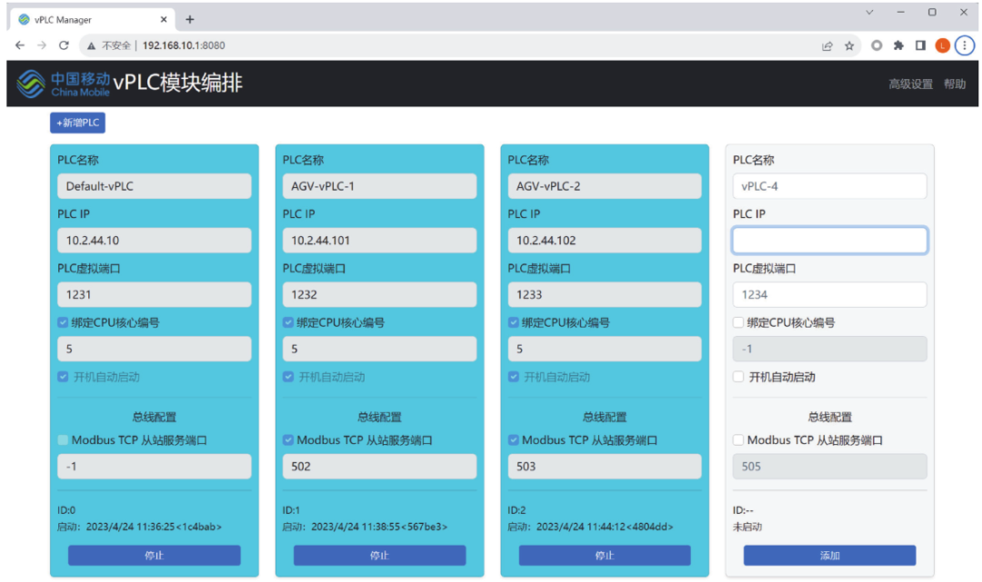 (3)vPLC編排為了支持UPF和網關統一編排,降低網關資源開銷,采用B/S架構開發輕量級編排系統。用戶通過瀏覽器進行前端操作,后端分為管理模塊和編排模塊實現PLC容器編排部署。管理模塊部署在服務器上,主要提供Web訪問、容器鏡像下載、配置和監測PLC容器等功能。編排模塊分別部署在UPF和網關上,主要提供容器鏡像拉取、容器環境配置、運行管理等功能。管理模塊和編排模塊通過HTTP相互通信。以容器運行監測為例,編排模塊通過Docker Client定時與本機Docker服務通信,獲取容器運行狀態信息,然后上報給管理模塊,當管理模塊發現狀態異常時進行異常處理。vPLC編排系統界面如圖8所示。