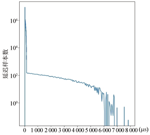 (1)Linux內核改造首先,通過集成Preempt-RT補丁將UPF、網關原有內核改造成實時內核,改造后的內核版本分別為Linux 4.18.16-rt和Linux 4.4.167-rt。在高負載情況下,改造前后進程處理最大時延可從8 ms降至500 μs。其次,配置CPU資源隔離將實時任務常駐特定CPU核心,降低任務切換開銷,將進程處理最大時延抖動進一步降到300 μs以下。再次,設計中斷路由,將外設中斷響應路由到其他CPU核心上處理,降低對實時任務運行的干擾。通過上述Linux內核改造,進程處理最大時延抖動可降到100 μs以下(見圖6、圖7)。