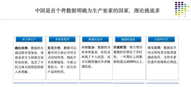 數據是一個生產要素,又是一個非常特別的要素,面臨的理論挑戰非常多。數據的獨特性質主要體現在以下幾個方面:首先是多主體生產因而確權困難,數據的生成過程錯綜復雜,常常是多方主體相互協作的結果,包含了不同主體不同程度的投入和貢獻,因此確權困難。其次是多場景復用方便,一組數據可以被不同主體以不同方式重復利用,在使用上不具有競爭性和排他性,不易清晰明確主張權力。第三是數據中的敏感信息多,許多數據的內容多層次多元化,可能承載了需要保護的個人信息和商業機密,即使匿名化和去標識化,也有可能被挖掘出來。第四是減損貶值快,絕大部分數據的價值在于實時性,有研究表明一年期以上的數據貶值達到 98% 以上,保值增值十分困難。各位想想,你經常點什么外賣,搜索過什么類型的服務、APP 就會推薦推送給你相關的內容,這都是從即時數據中挖掘到的,幾個月后可能你的口味發生了變化,按照現在數據推送就沒有意義。第五是具有交易和交互兩類流通方式,特別是交互型流動即數據在不同主體間的非交易型流通使用,與其他生產要素流通使用的形態相比有顯著不同。這個是我們后面要分析的重點問題。考慮到上述問題,在“數據二十條”的起草制定中,針對數據要素這些與其他生產要素不同的特點,文件的重點是構建起主要架構,即所謂的“四梁八柱”,許多更具體的內容都需要不斷探索發展,并從社會有較多共識、實踐有迫切需求、符合數據要素特征、與理論體系有較好契合性這些角度排出工作的重點。例如,在起步階段不回避“所有權”,但更強調持有權、使用權、經營權,讓數據先動起來用起來,就是現階段中國特色數據產權制度的一個鮮明特點。再如,處理好場內交易和場外交易的關系也是現實針對性很強的問題。從實踐看,數據流通使用既有通過數據交易所完成的“場內交易”,也有企業與企業之間直接發生“場外交易”,更有規模巨大的非交易型的數據交互。因此“數據二十條”并未強調以哪種流通方式為主,而是提出場內交易與場外交易相結合,不斷探索創新。在公共數據開放共享和開發利用、構建安全貫穿數據治理全過程的安全治理模式等方面,也都從理論與實踐的結合出發,既提出長遠發展方向,也明確當下工作重點。
