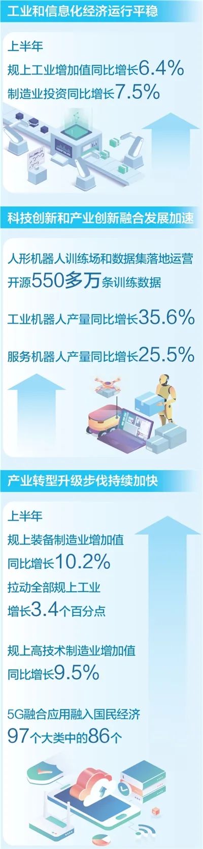 規模以上工業增加值一季度和二季度同比分別增長6.5%和6.3%;規模以上高技術制造業增加值同比增長9.5%,對全部規模以上工業增長的貢獻率為23.3%;實施制造業大規模設備更新和技術改造升級工程,制造業投資同比增長7.5%……7月18日,國務院新聞辦舉行新聞發布會,工業和信息化部總工程師謝少鋒等介紹了上半年工業經濟運行情況。
